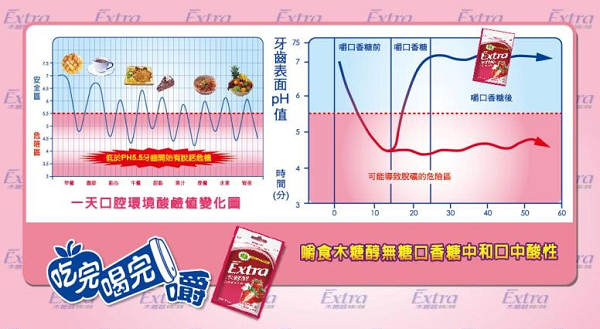 「由於用餐後的10分鐘為口腔酸性的高峰期,會破壞口腔健康,因此餐後『黃金10分鐘』是為保護口腔的關鍵。現代人在外用餐的機會多,不方便刷牙時,最簡便就是嚼食木糖醇無糖口香糖20分鐘刺激唾液分泌,中和口腔酸鹼值,而唾液含有鈣及磷酸鹽,是天然的防禦成分,能幫助牙齒再礦化。木糖醇的成分還可抑制口腔內突變型鏈球菌生長與代謝,可達到降低齲齒的發生率,具有優越的保護口腔功效。」